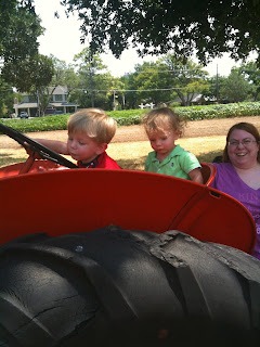 After about a hundred U-turns we finally found the place and a parking spot. We had a ton of fun even though it was incredible hot. The first thing we did was a tractor ride. Poor Preston was so scared. He was shaking like a leaf before we got on. He was fine once we go on and were going. The driver stopped about half way through the ride to tell us about the different things planted in the garden and some other upcoming events. It was Ethan turn to freak out a little bit and wanted off but once it started moving again, he was fine. Once the ride was over Ethan couldn't get enough of the tracker that were at the farm. We were able to get him to check out the chickens and the lamb. When he was in with the chickens he was making clucking noises at them. It was really adorable. Then he checked out the lamb. He wasn't that interested in the lamb but wanted to go back to the tractors. Preston on the other hand loved the lamb and just riding around in the stroller. It is experiences like today that I know it was the best decision for me to stay home. I can't thank Korri enough for going with me and the boys today.